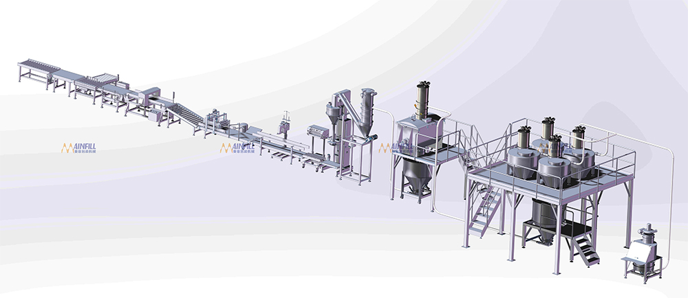 投料、暂存、配料、混合、供料、充填、热封、缝包、倒袋、整形、重量检测、金属检测、剔除和喷码包装系统